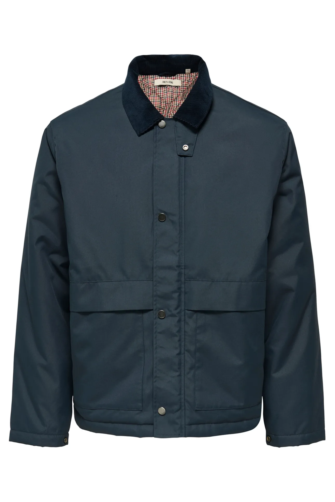 – Corte recto, cuello cásico, cierre de cremallera con solapa con botones a presión, bolsillos frontales con solapa y forro interior visible con estampado de cuadros.