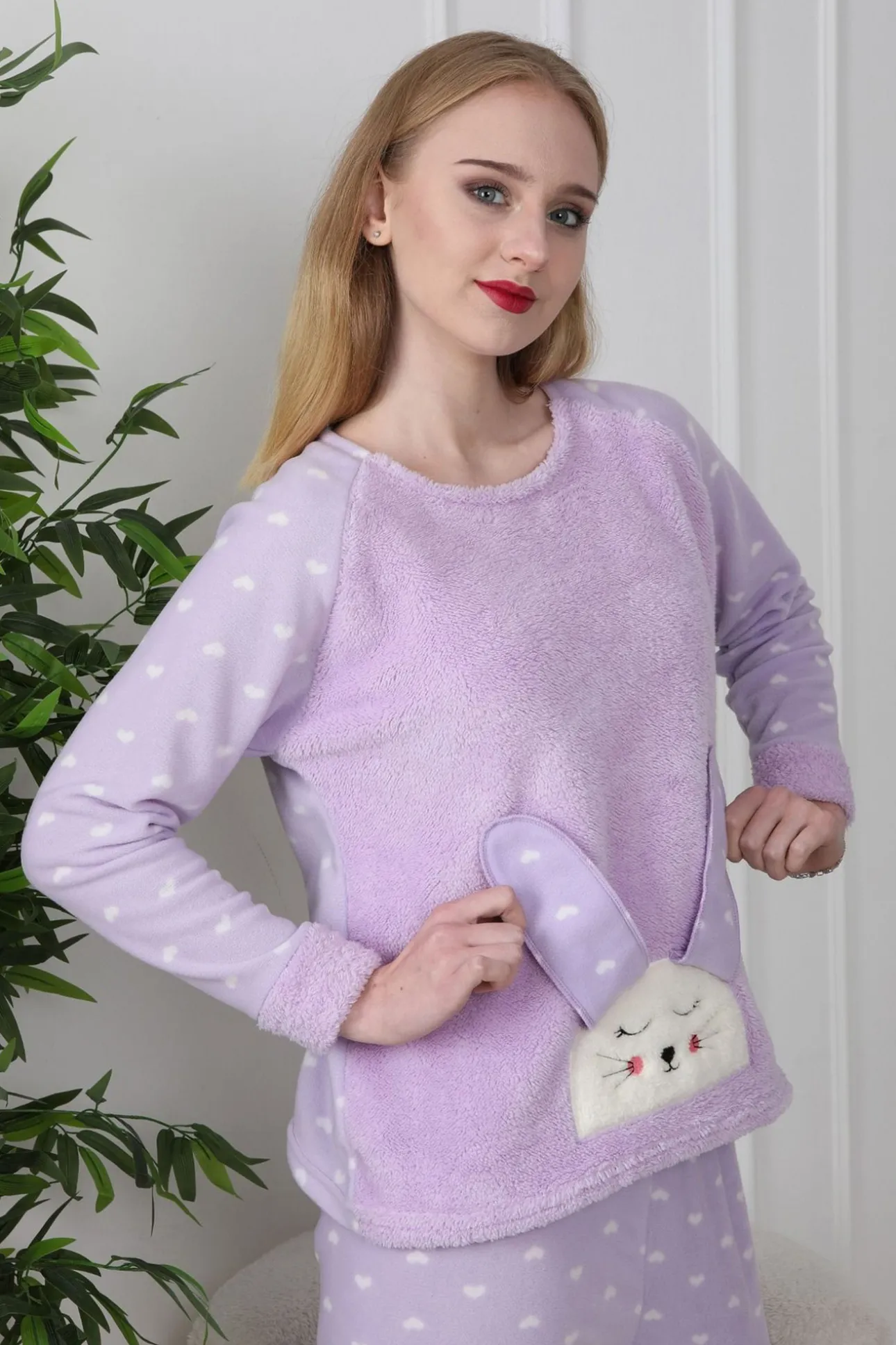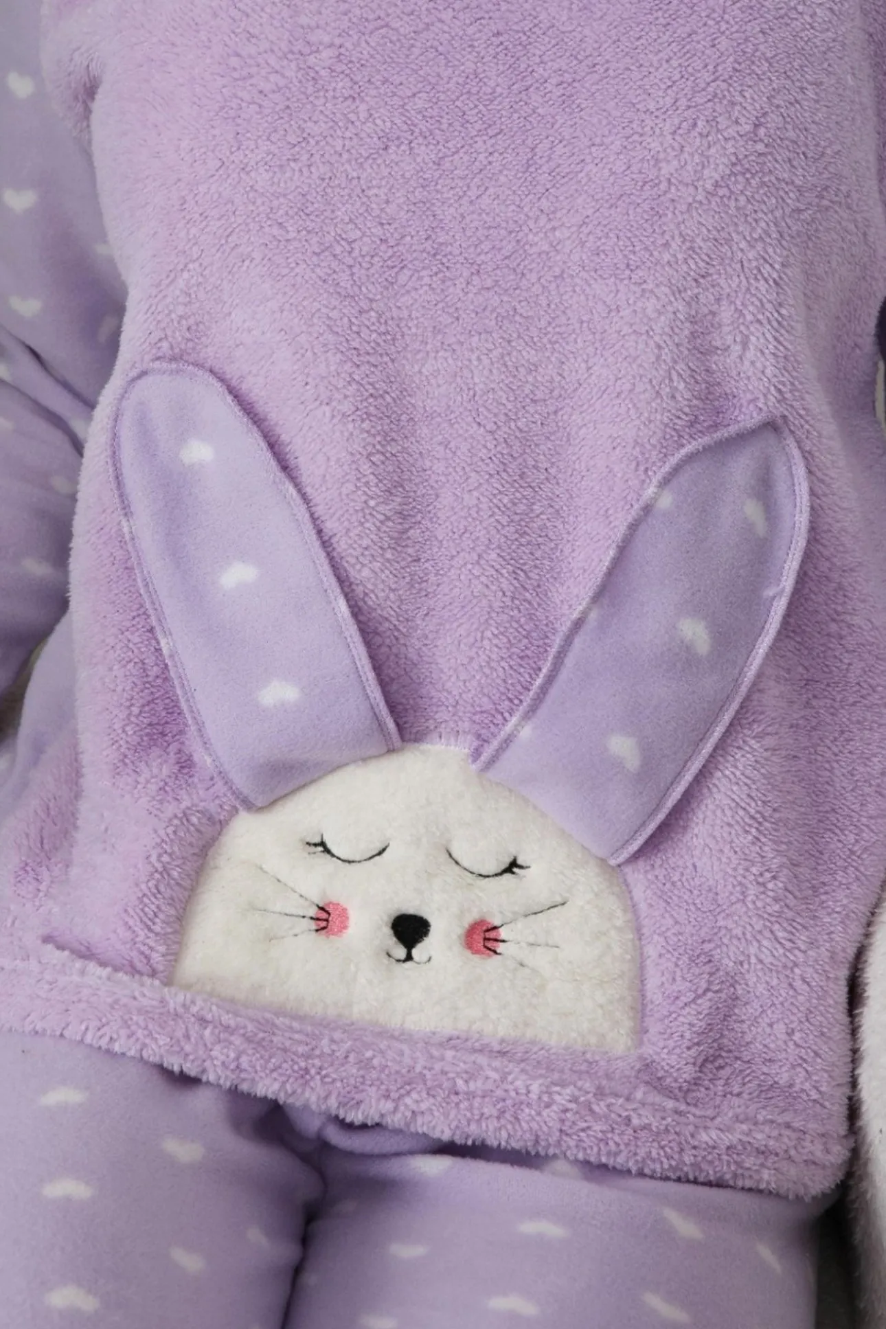 Conjunto pijama polar conejo y corazones lila