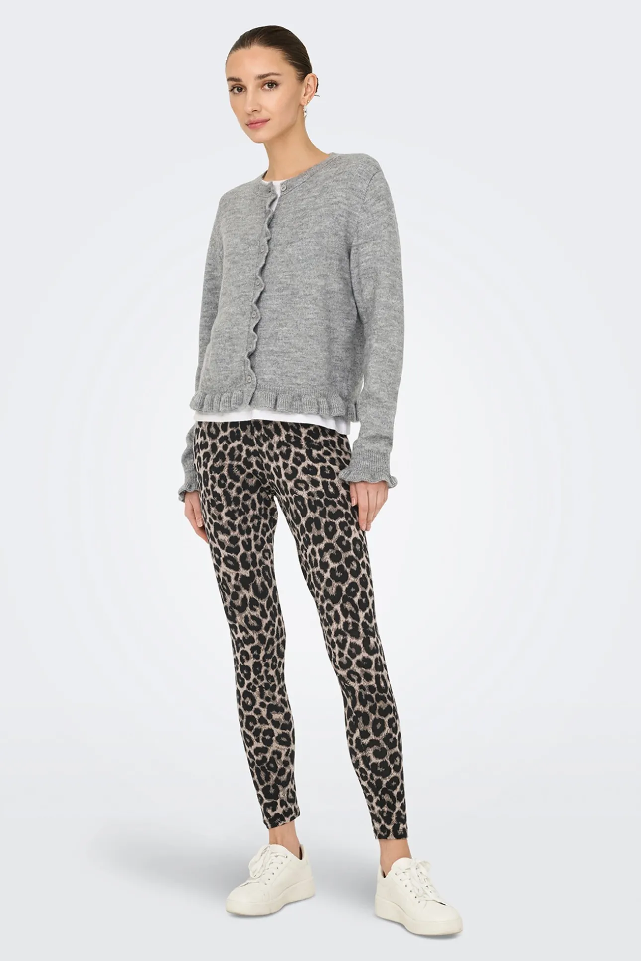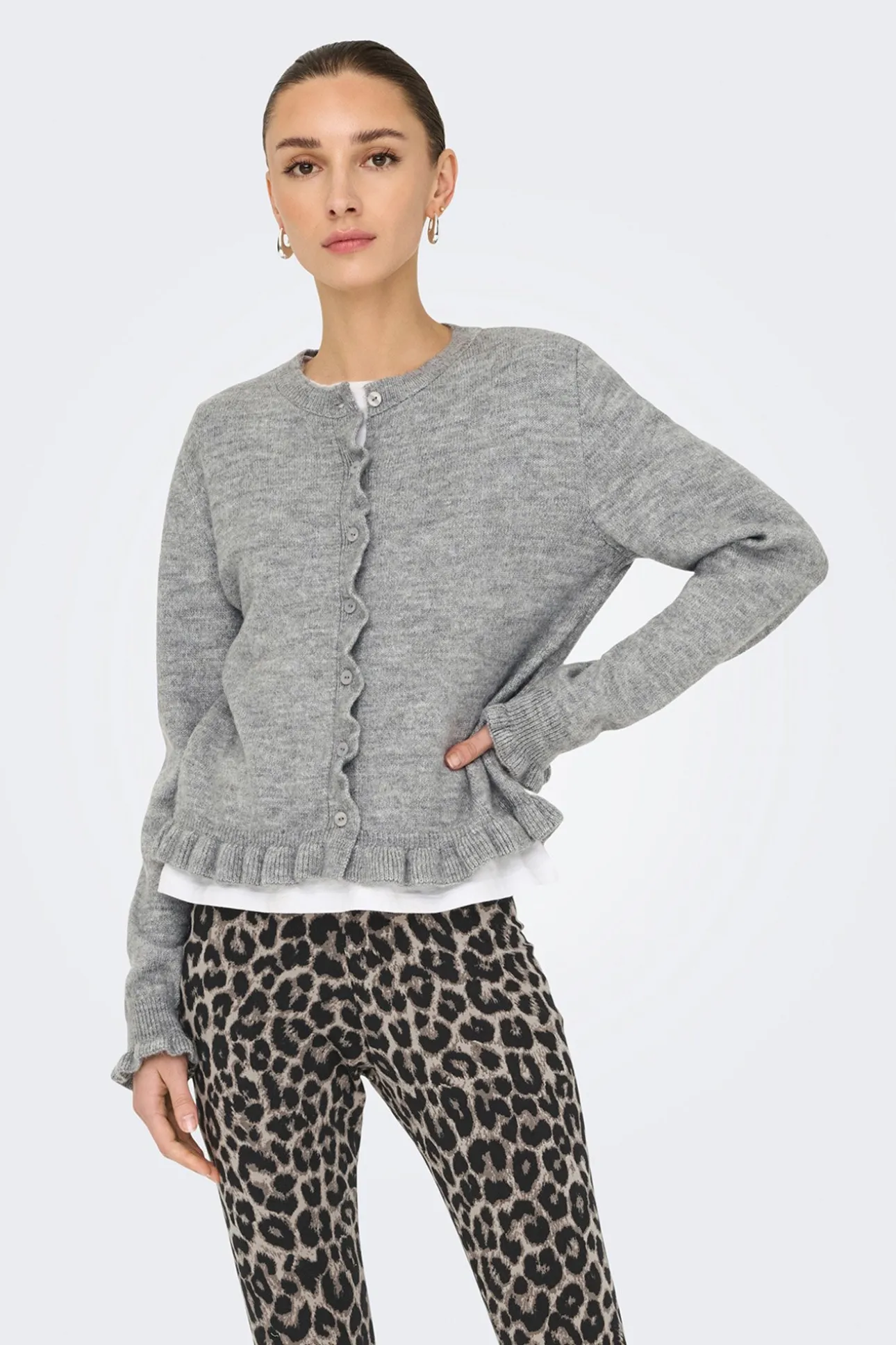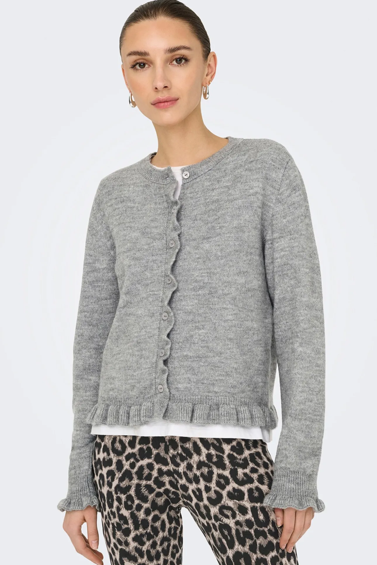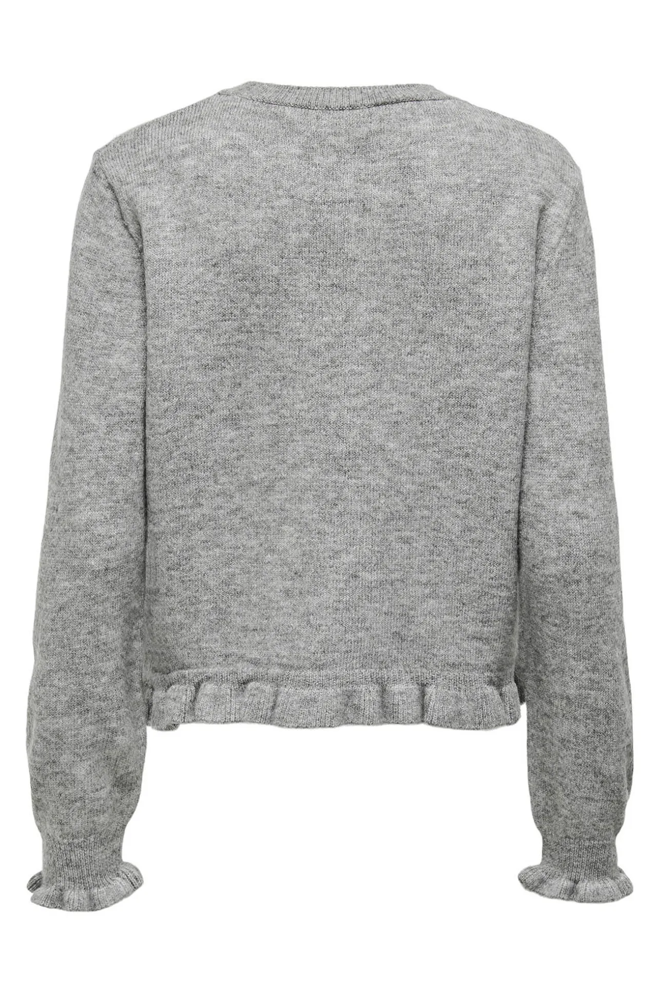 – Corte recto, manga larga, cuello redondo y detalle de volantes.