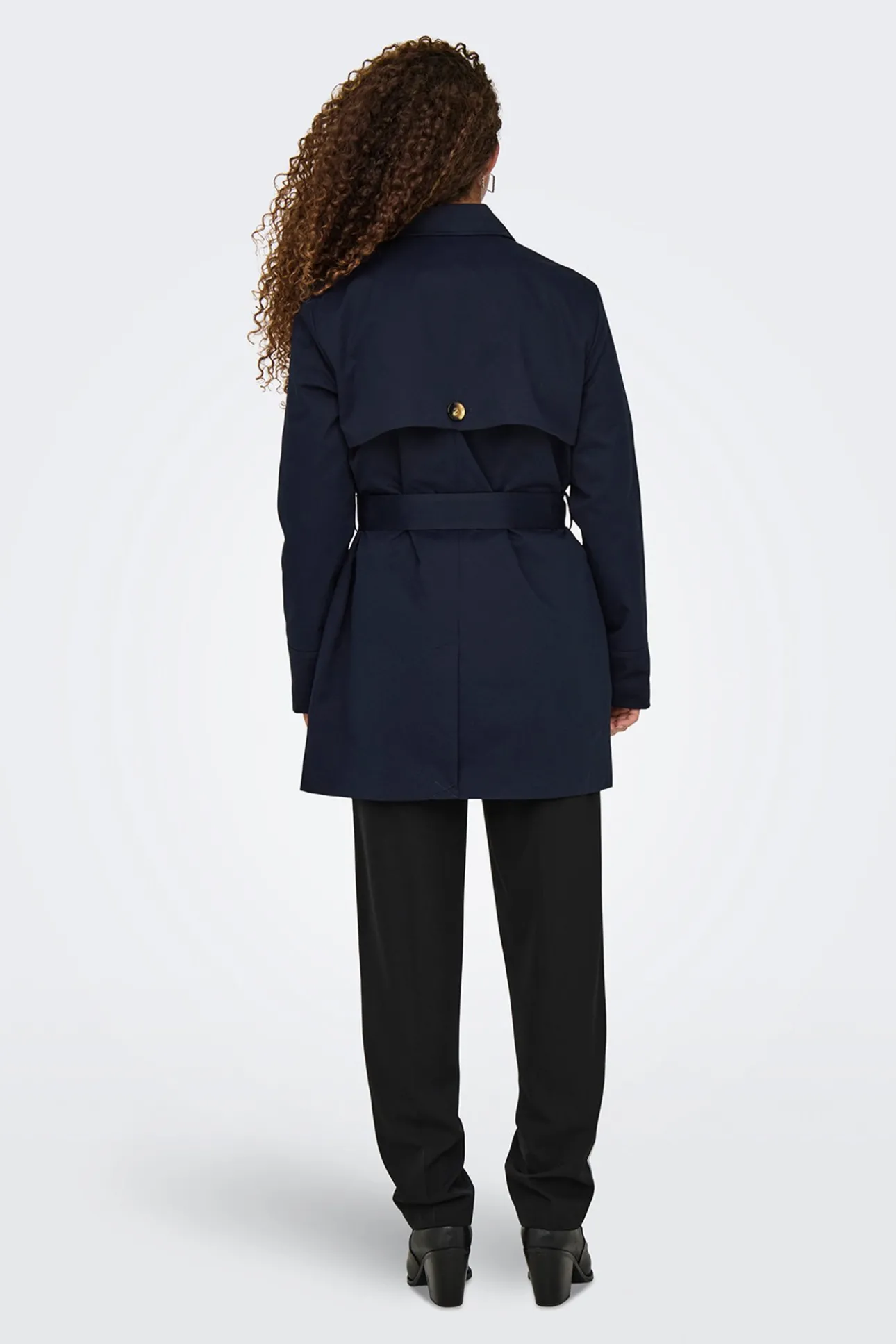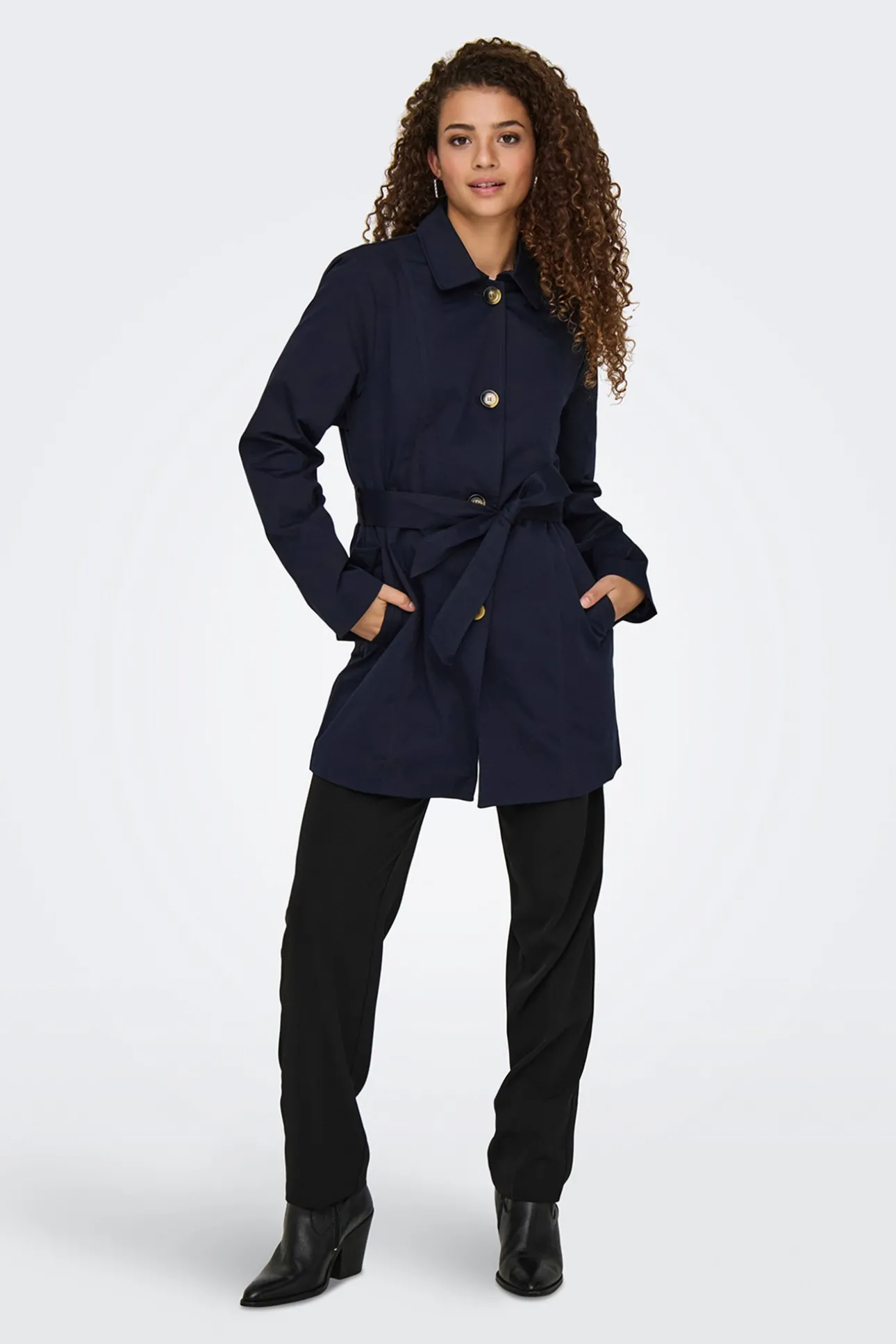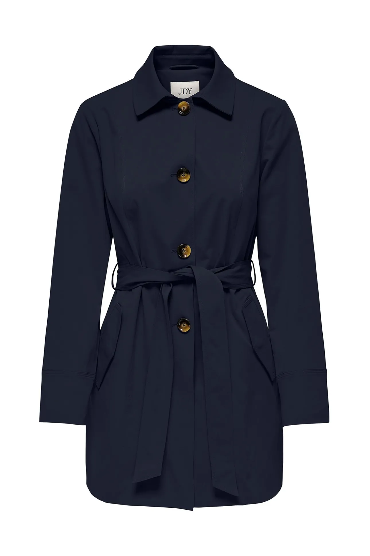 – Corte recto, cuello clásico, manga larga y bolsillos laterales con solapas.