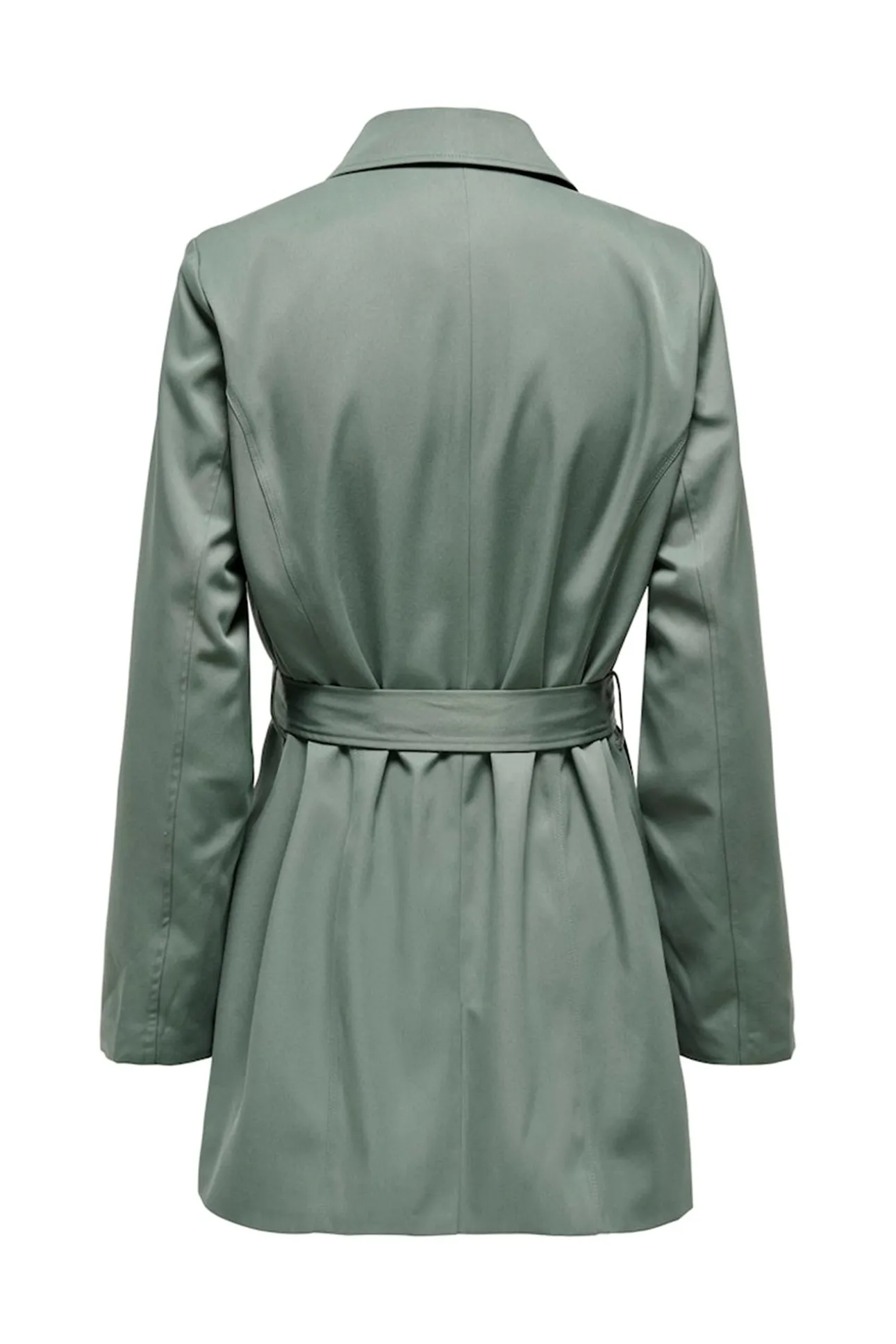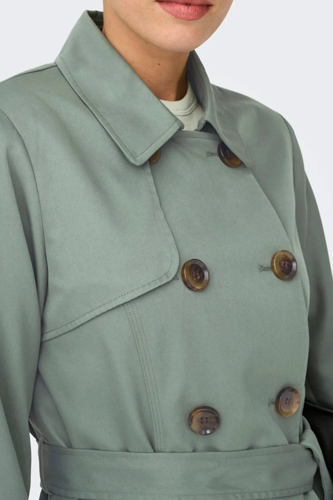 – Cierre frontal cruzado con botonadura doble y cinturón del mismo tejido.