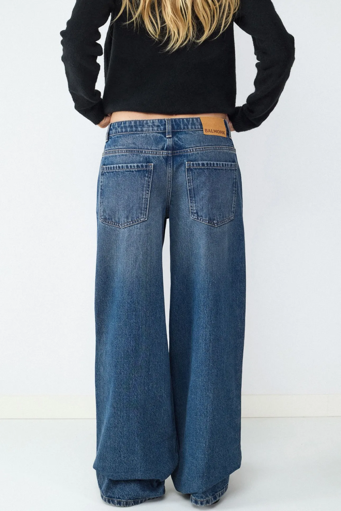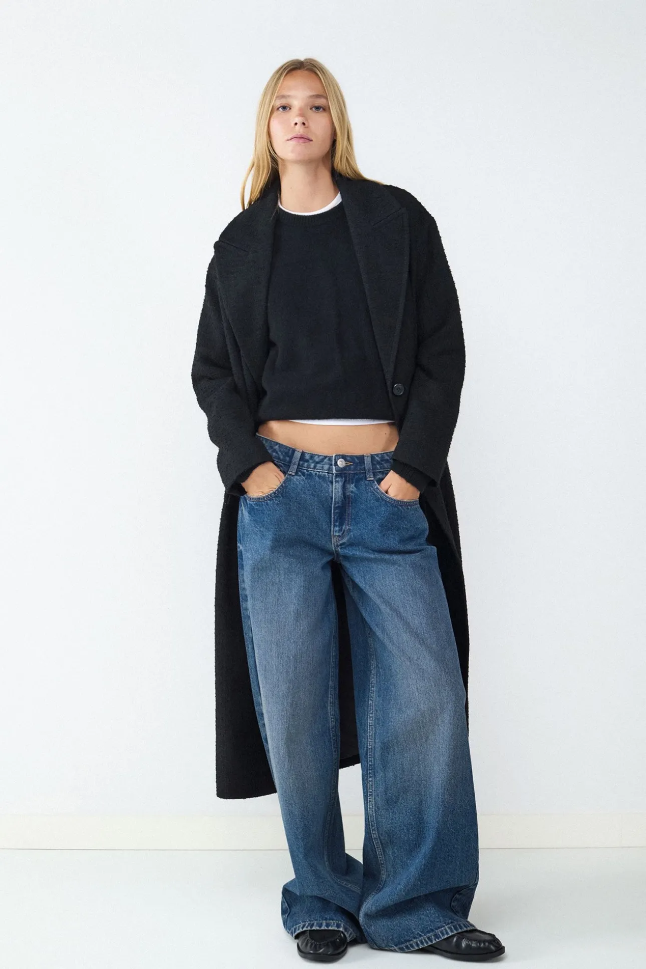Jeans de tiro bajo. Diseño de pierna ancha desde la cadera hasta el bajo. Estilo de cinco bolsillos con cierre de cremallera y botón metálico. Este producto talla más grande de lo habitual.