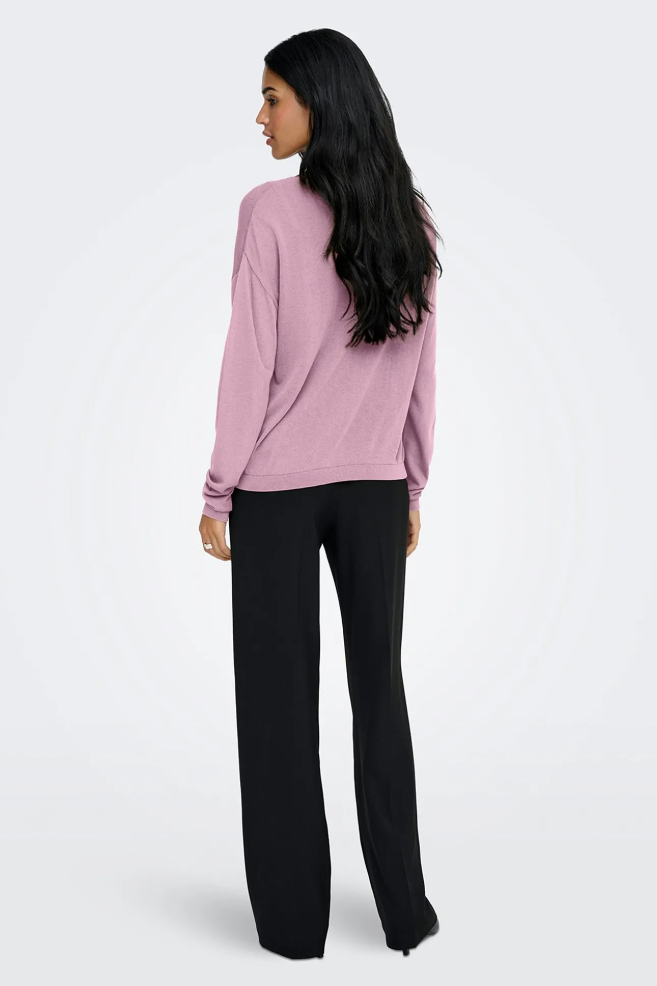 – Corte holgado, manga larga y bajos acanalados.
