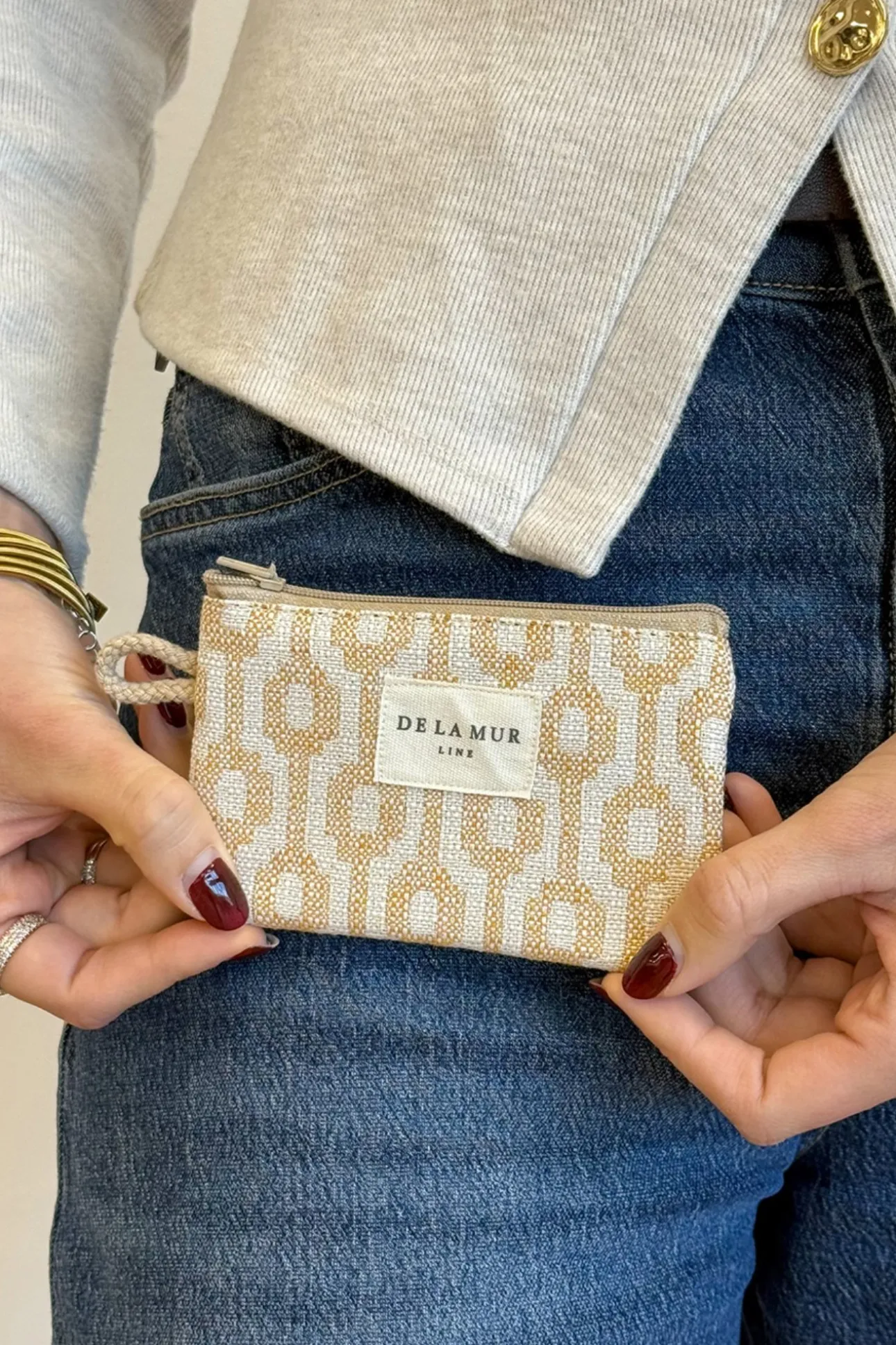 Monedero con cremallera en la parte superior y pequeña asa de cordón de color beige en el lateral. Con tejido grueso de jacquard 80% algodón y 20% poliéster con estampado geométrico en tono beige y mostaza. Cada articulo puede tener una variación en el estampado, dependiendo de donde se haya efectuado el corte de la pieza. Forrado de tejido grueso de color gris en la parte interior. Para su correcto mantenimiento se aconseja lavarlo en frío y no utilizar secadora.