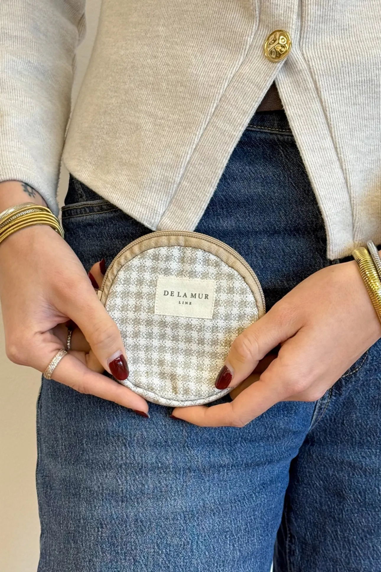 Monedero redondo con cremallera en la parte superior. Con tejido grueso de jacquard 80% algodón y 20% poliéster con estampado a cuadros vichy en tonos beige y crudo. Cada articulo puede tener una variación en el estampado, dependiendo de donde se haya efectuado el corte de la pieza. Forrado de tejido grueso de color gris en la parte interior. Para su correcto mantenimiento se aconseja lavarlo en frío y no utilizar secadora.