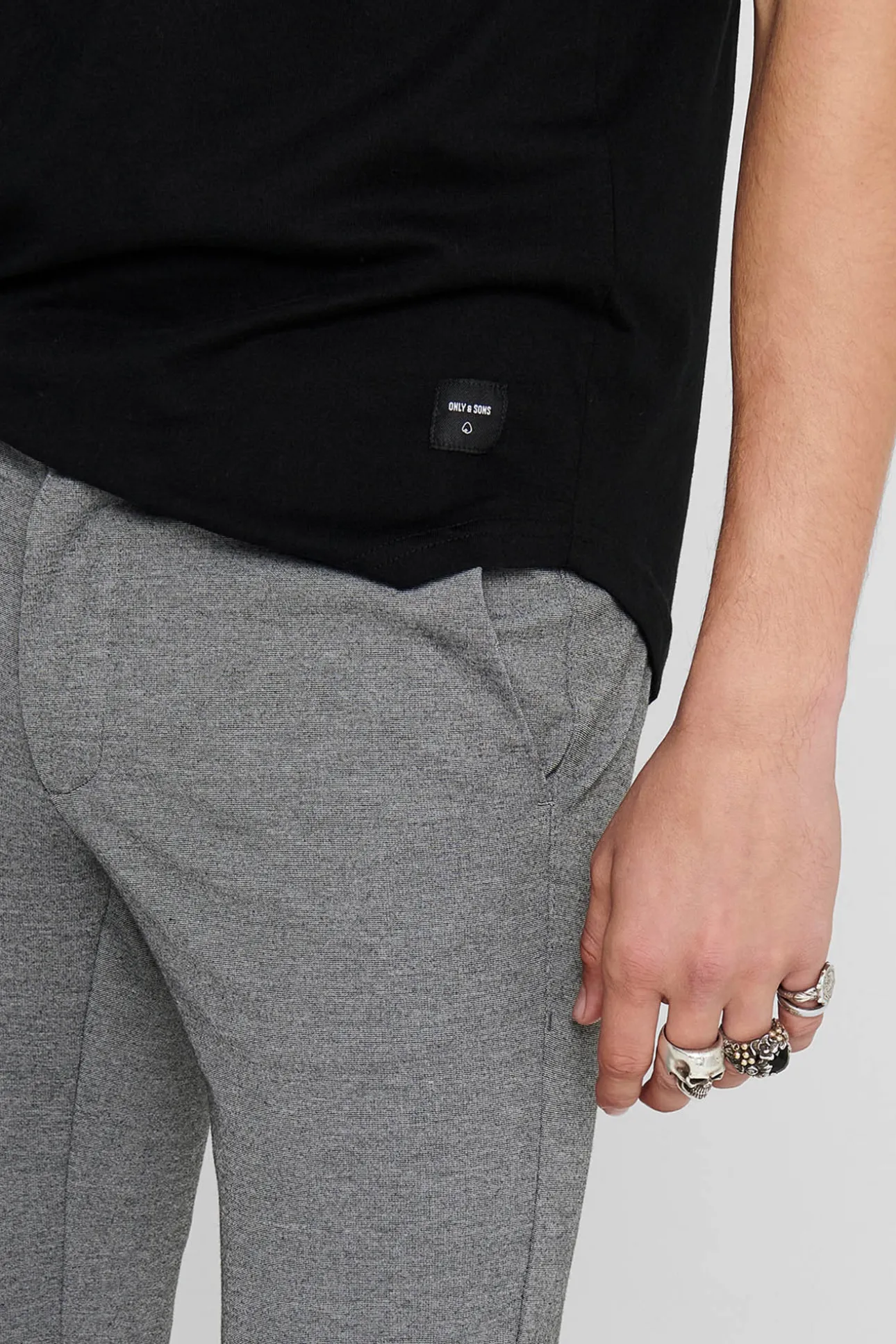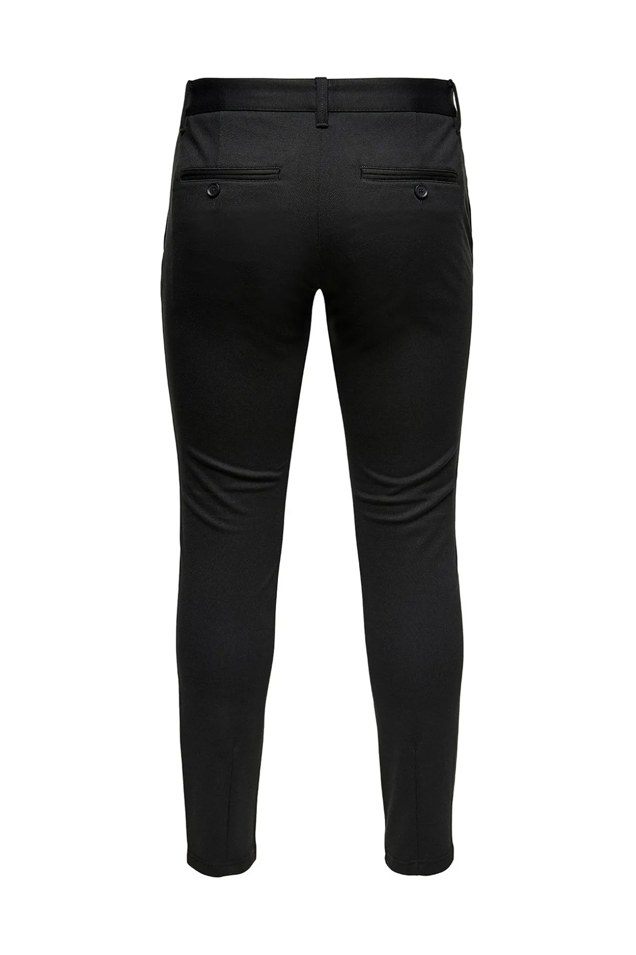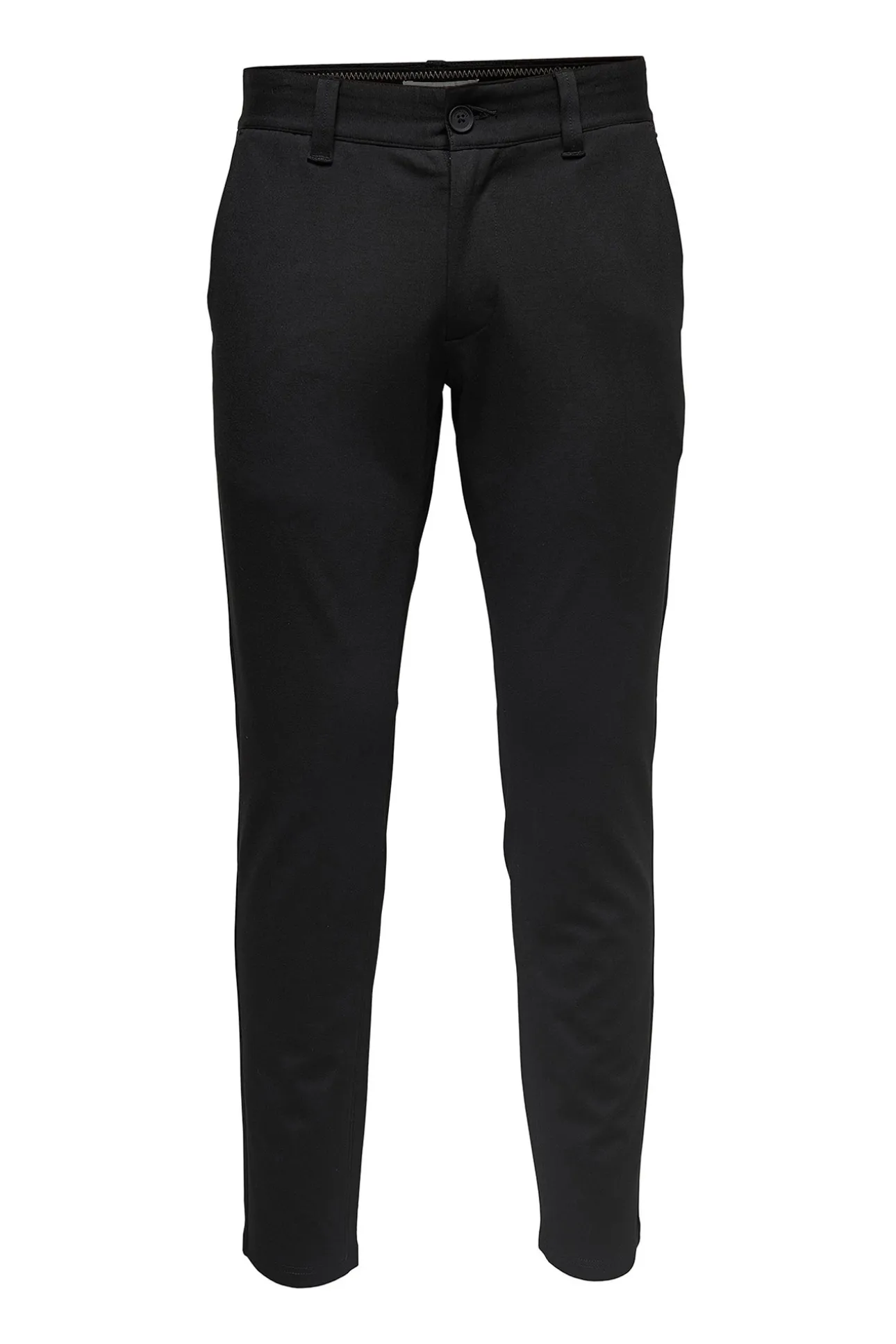 – Corte recto, tiro medio, cierre con botón y cremallera, trabillas para cinturón y bolsillos.