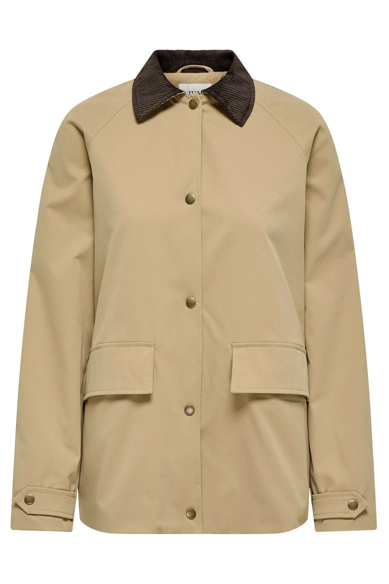 – Corte recto, manga larga con puños ajustables, cuello clásico de pana a contraste, cierre delantero de botones automáticos metálicos y bolsillos frontales con solapas.