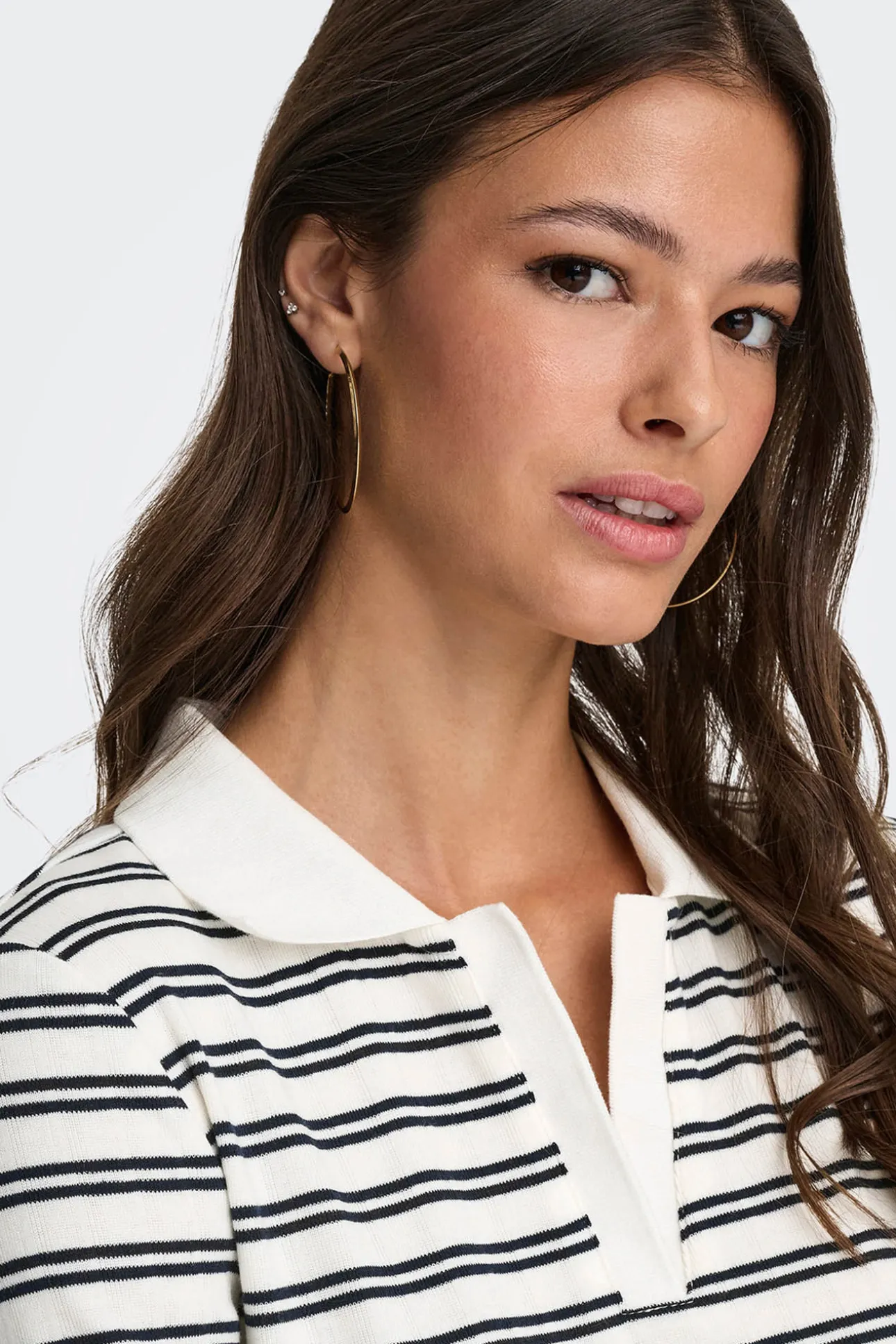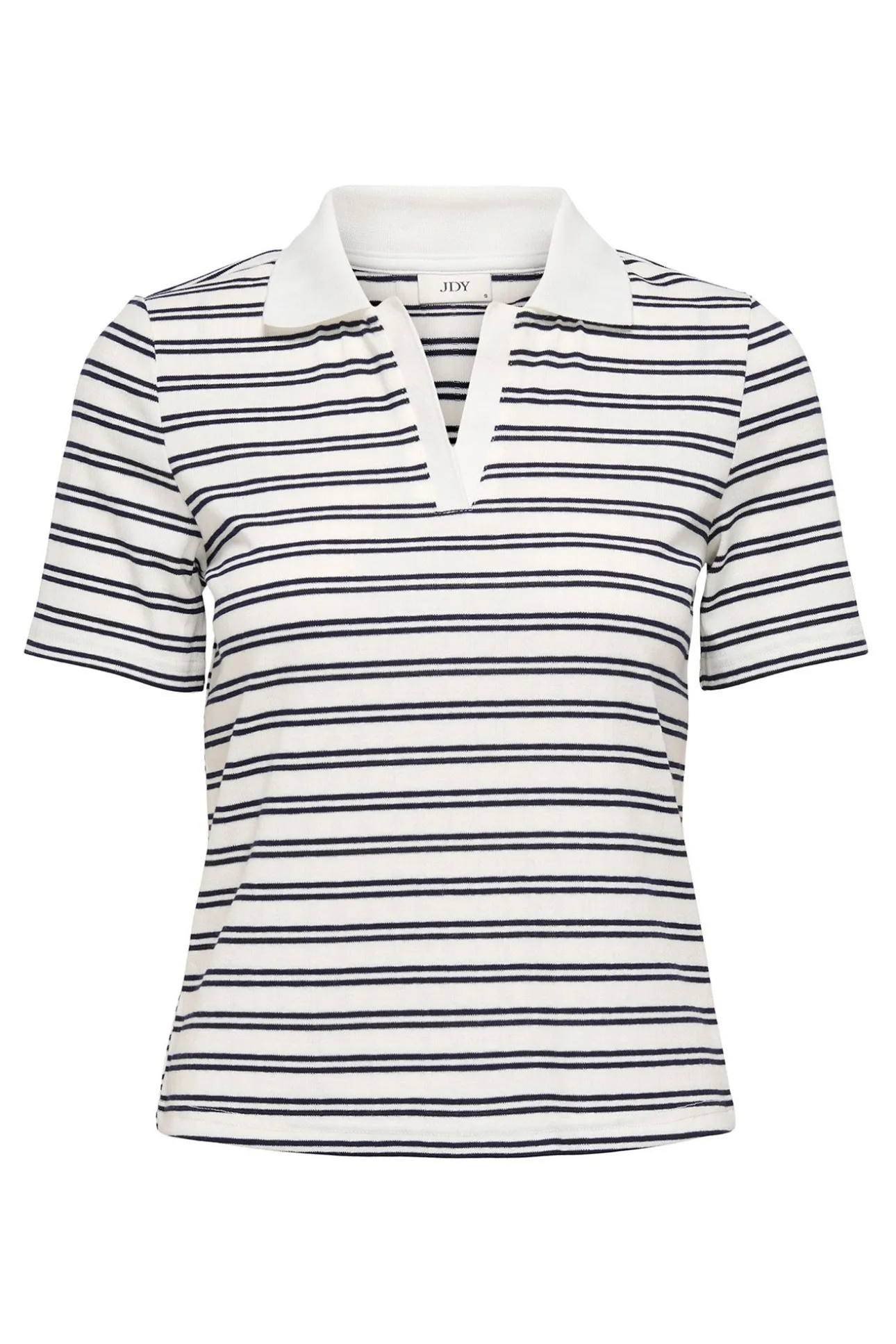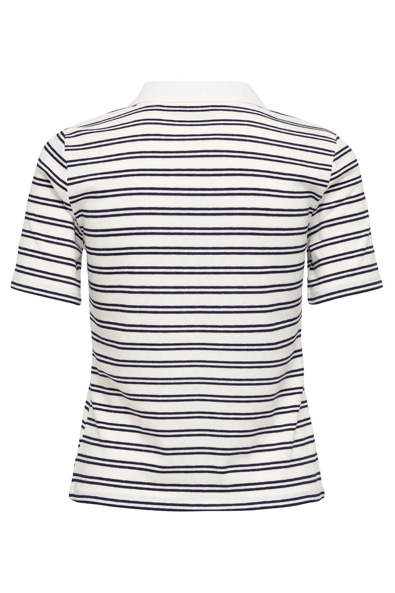 – Corte recto, cuello clásico abierto en pico y estampado de rayas.