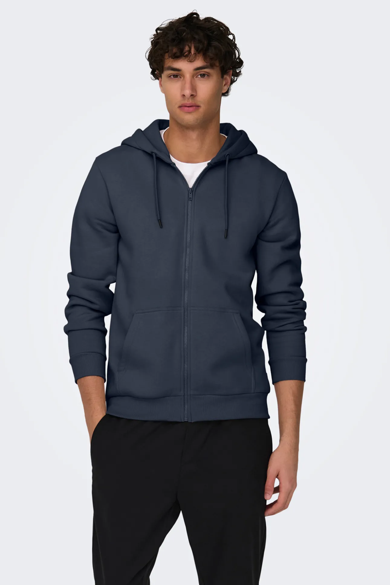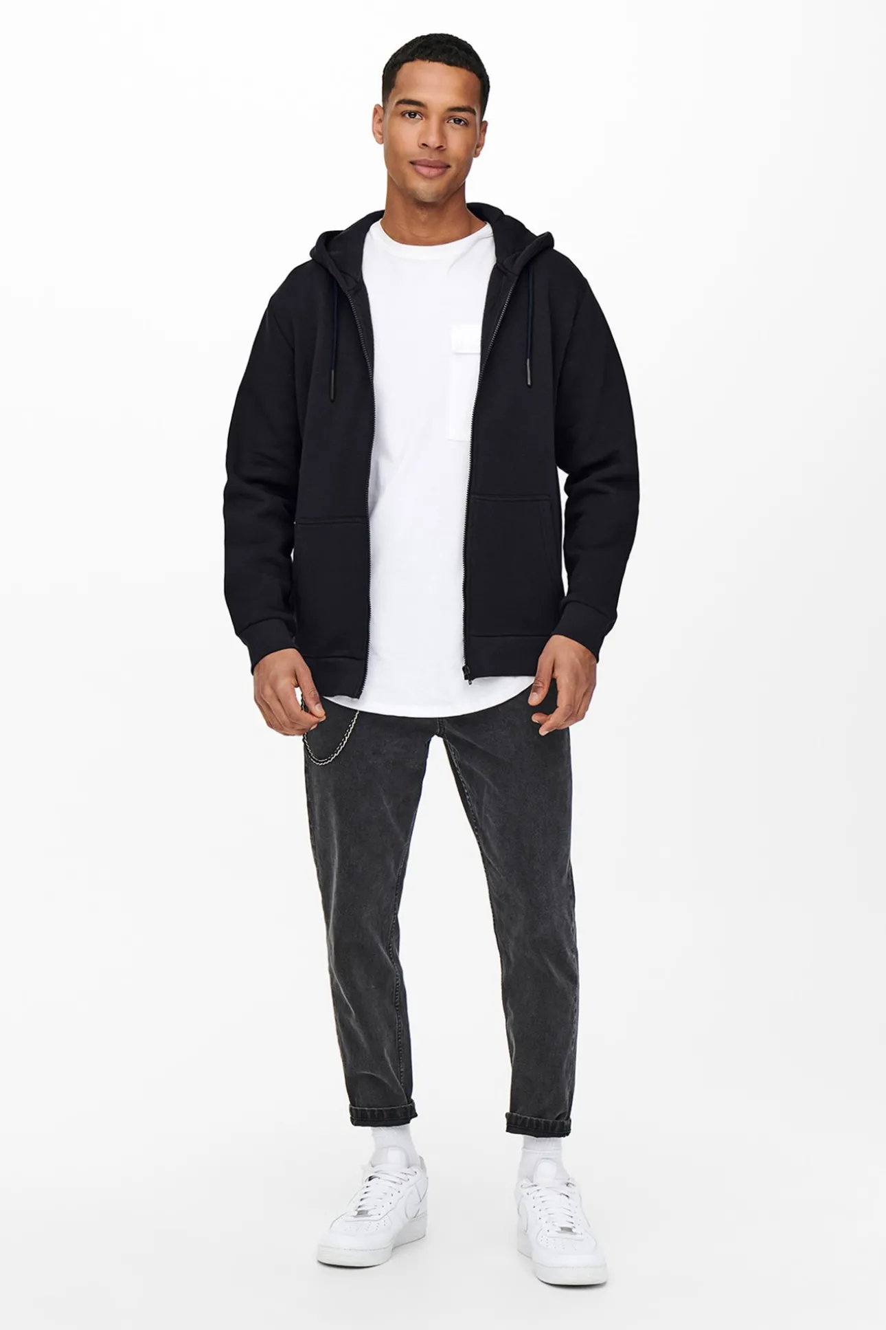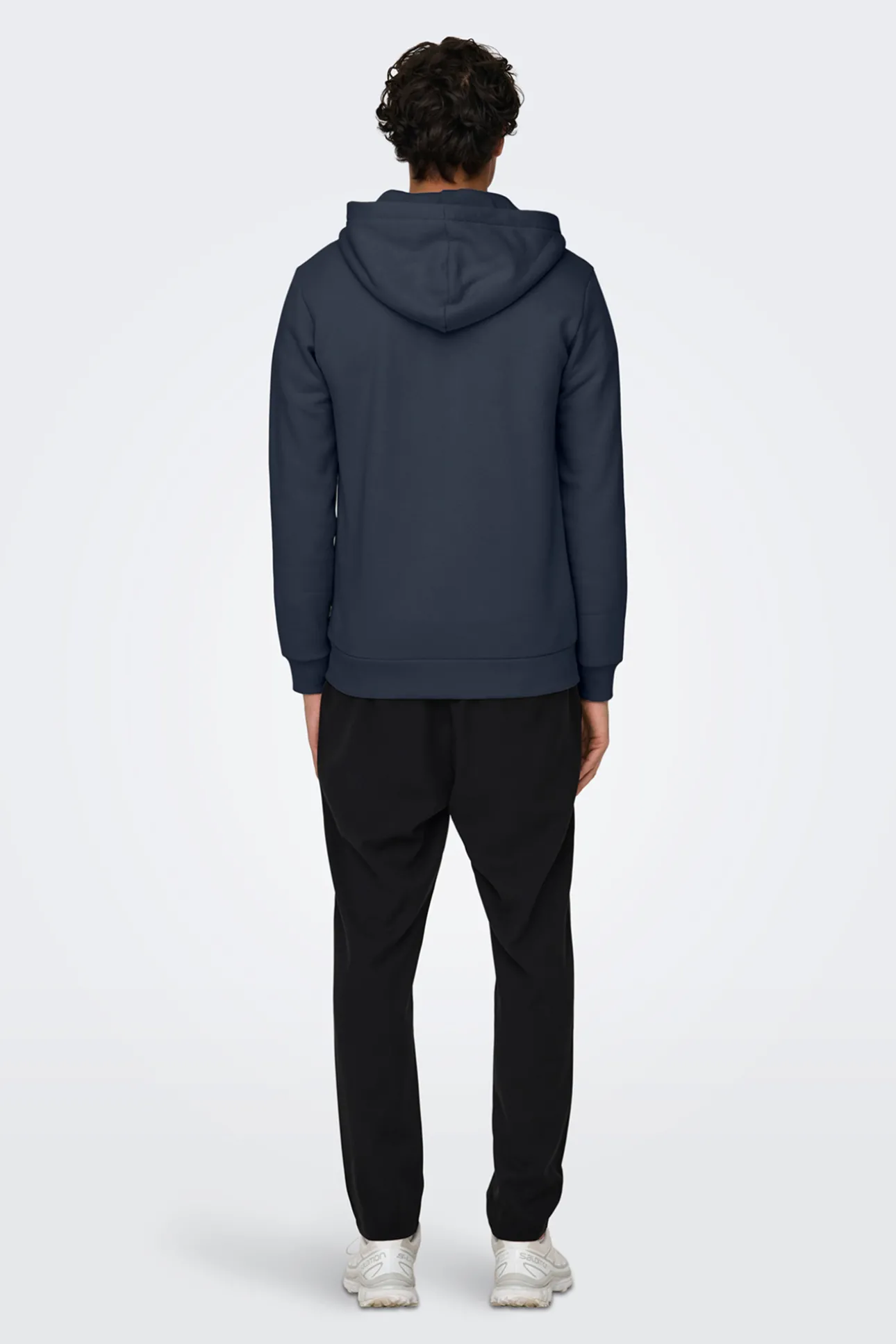 – Corte regular, manga larga y capucha ajustable con cordones.