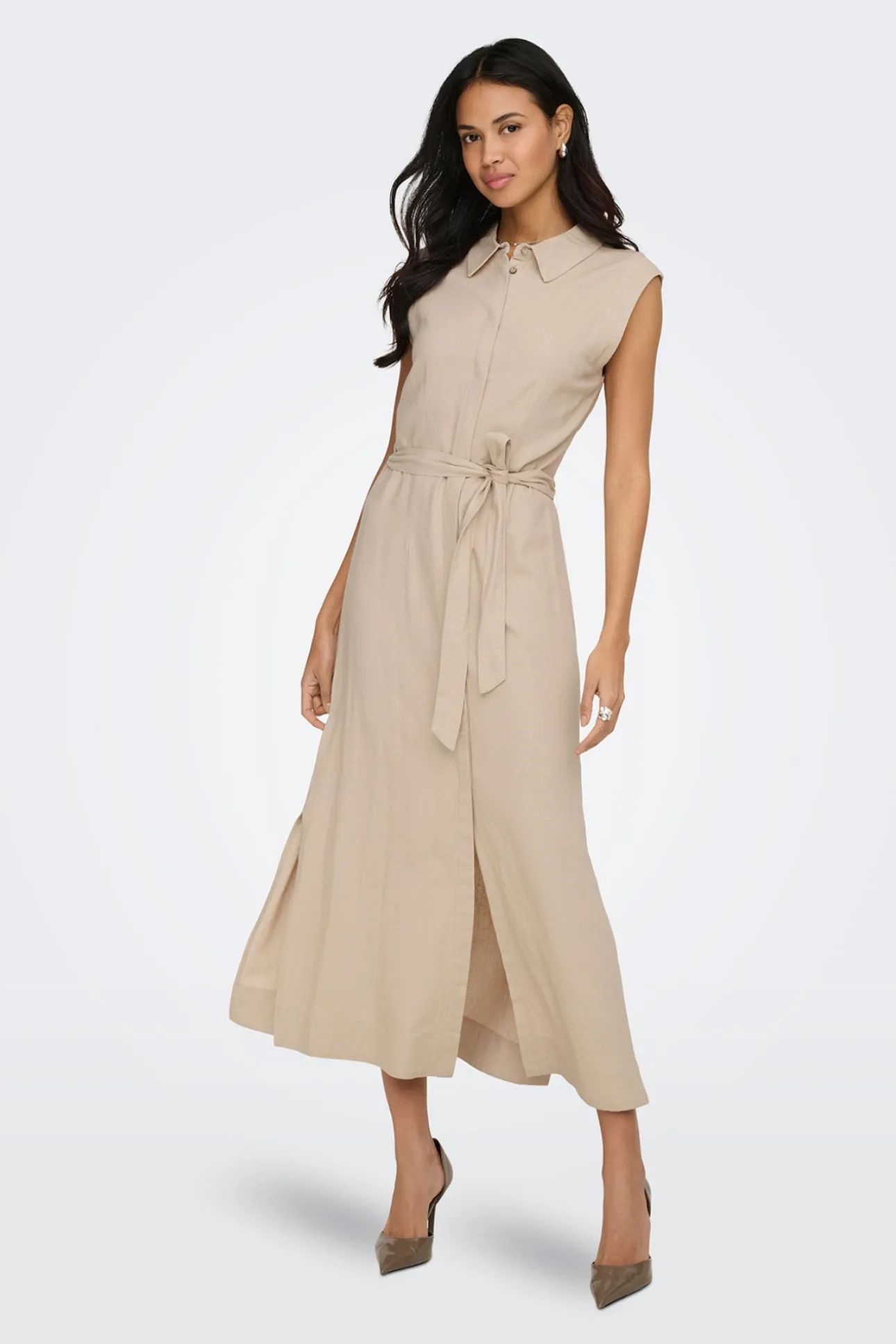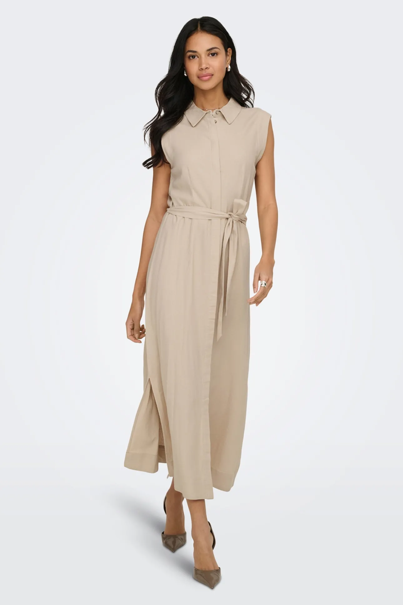 – Cierre frontal de botones ocultos. Cinturón del mismo tejido.