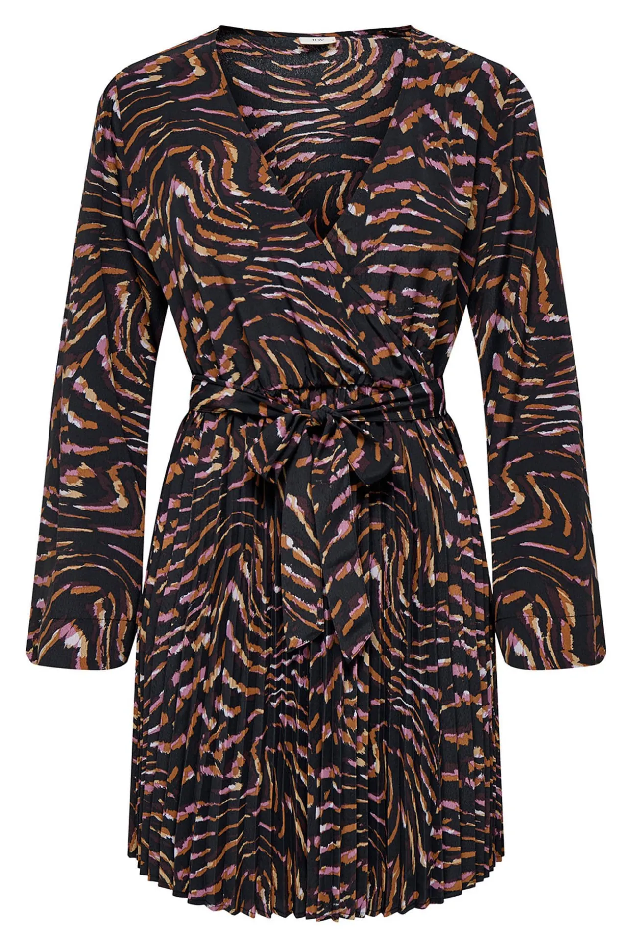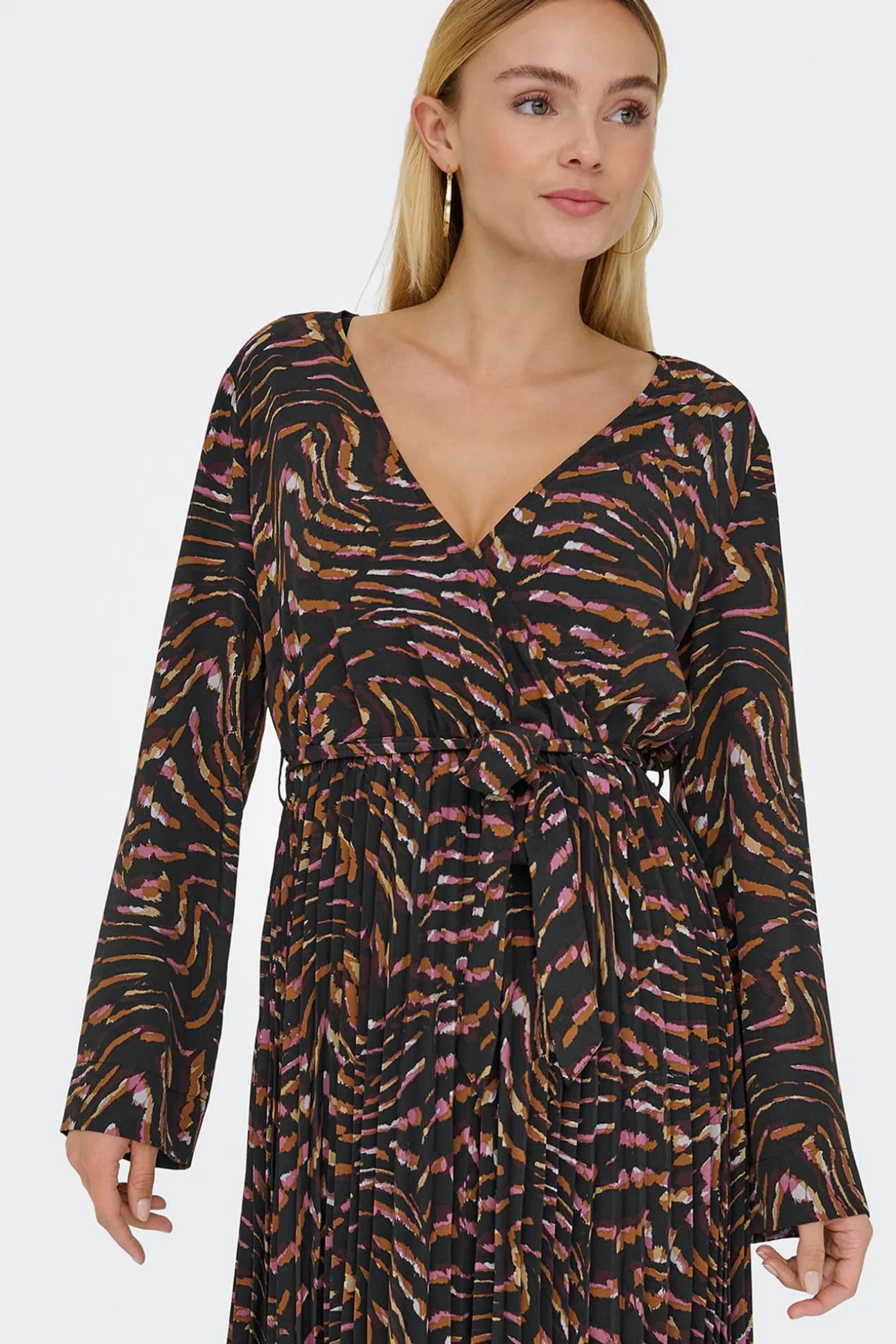 – Corte recto, manga larga ancha, escote cruzado en pico y lazo ajustable en la cintura.