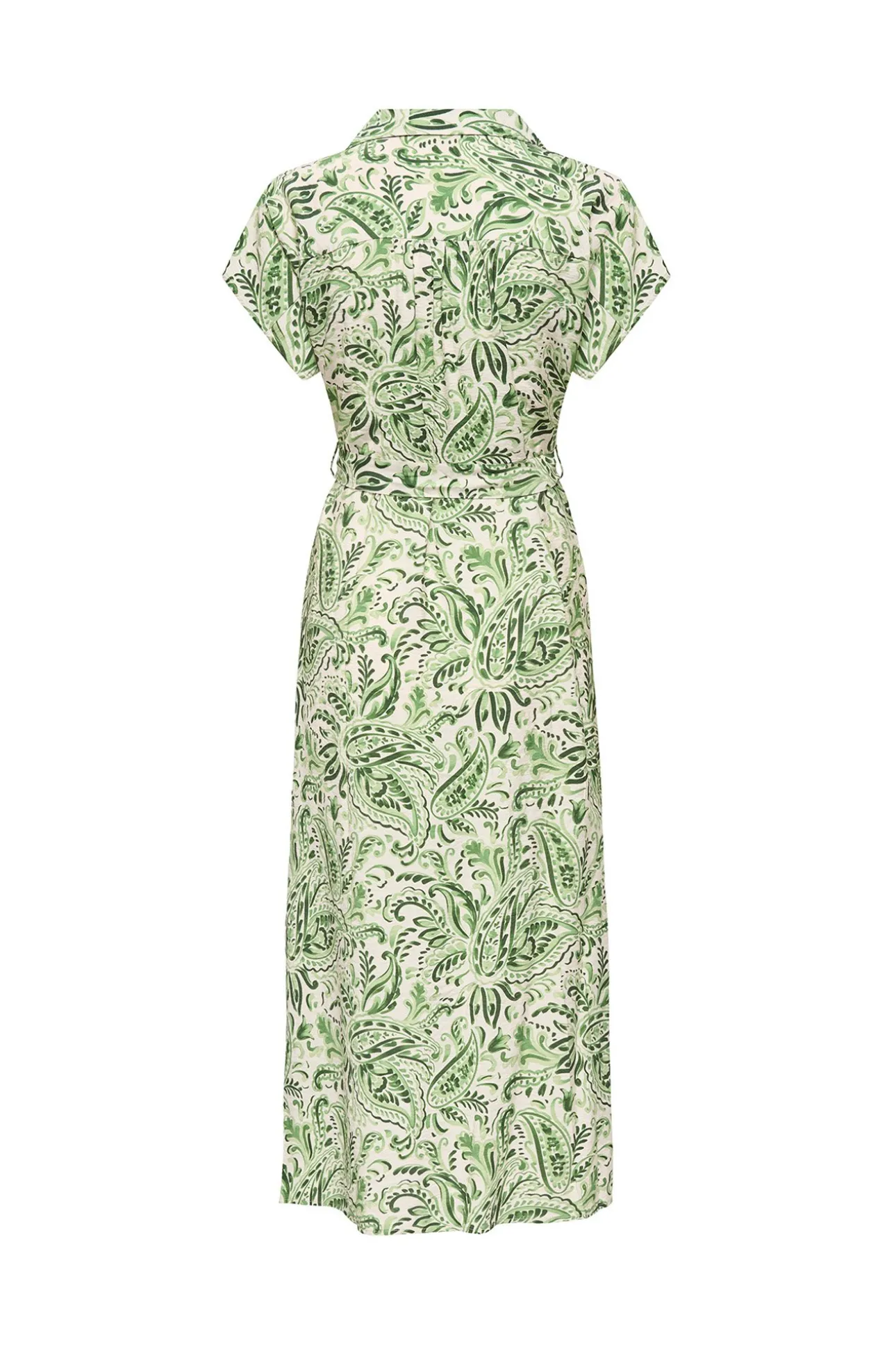 – Corte fluido, cuello camisero con escote en pico cruzado, manga corta y lazo ajustable en la cintura.
